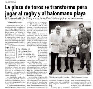 Repasando la prensa me he llevado una grata sorpresa al ver, en La Voz de Galicia, este pequeño reportaje recordando nuestros comienzos. El artículo ha abierto la caja de recuerdos que llevaba tiempo cerrada y me ha hecho consciente de lo rapido que pasa el tiempo, pues parece que fue ayer cuando celebramos la reunión en la que tomamos una decisión trascendental para los intereses deportivos de nuestros chicos, desconocedores del futuro que nos esperaba. Se me ha erizado el vello recordando las carreras, agobios y muchos, muchos cafés para sacar el proyecto adelante junto a mis copmpañeros de aventura, dos fenómenos de nombre Félix Álvarez y Alberto Fernández. Un proyecto en el que, con unos primeros pasos lentos pero firmes, se afianzaron los cimientos de lo que hoy conocemos como Pontevedra Rugby Club, nacido con la idea de llegar a ser un referente en el deporte de nuestra ciudad.